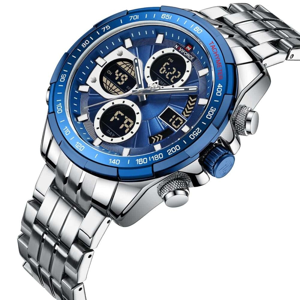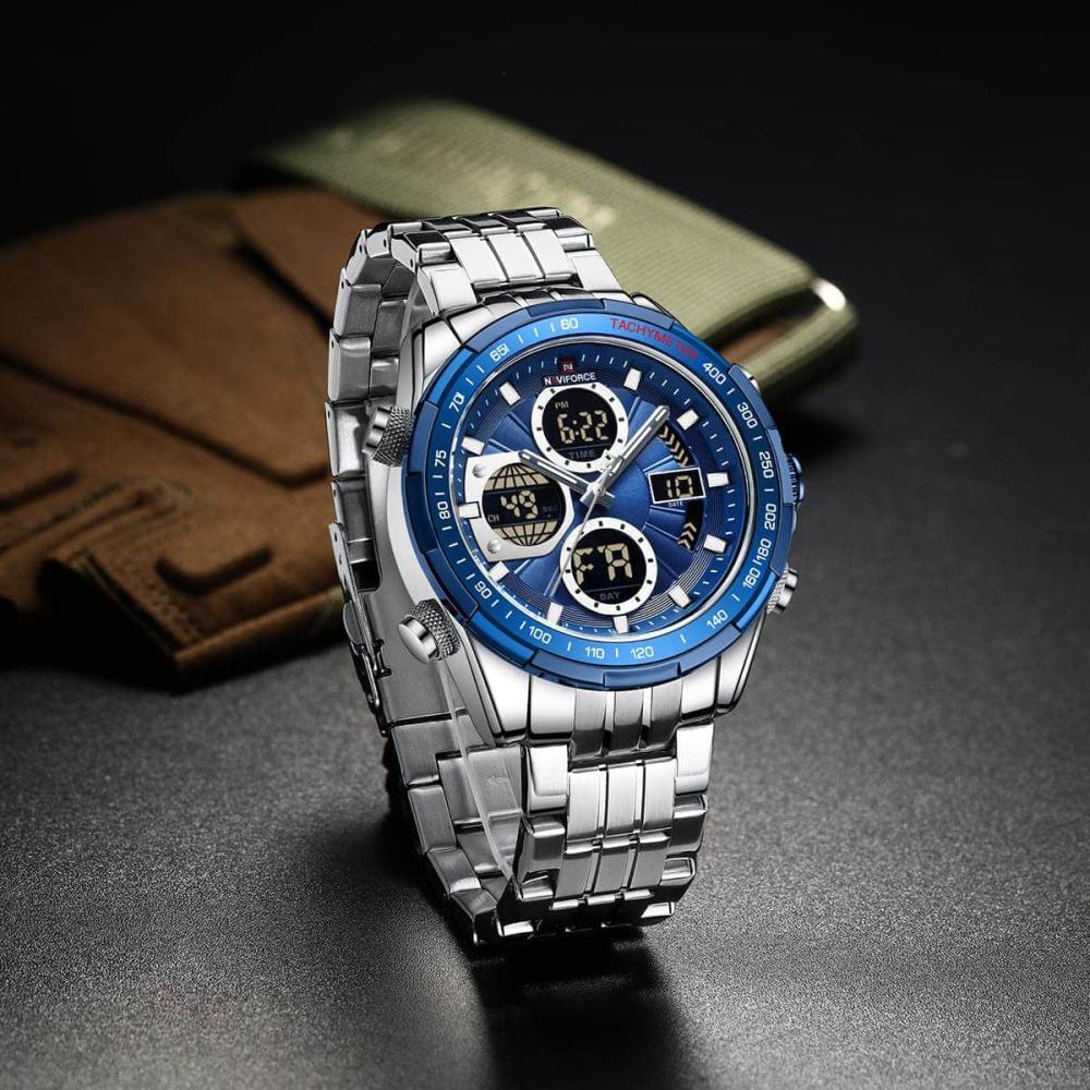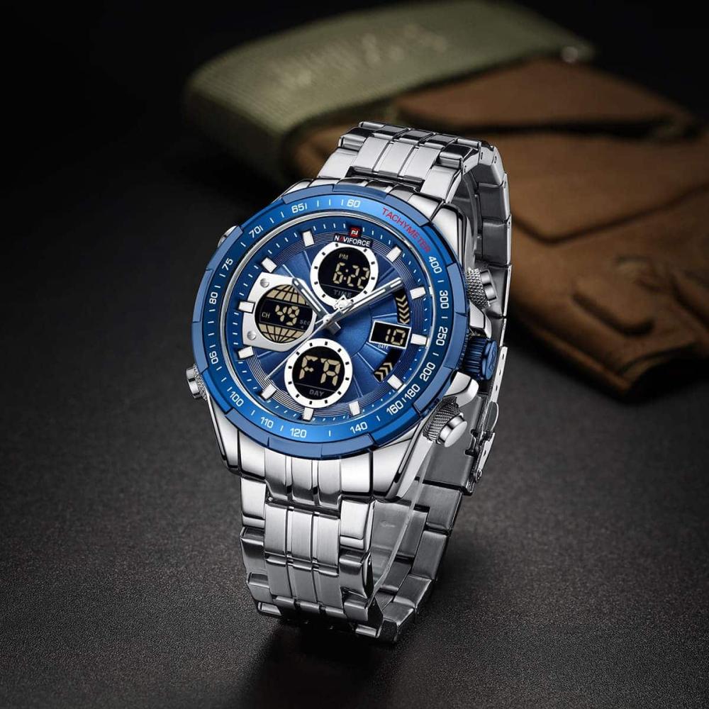 الساعة في الصورة هي من طراز Naviforce 9197، وهي ساعة يد رجالية تجمع بين العرض التناظري والرقمي. تتميز الساعة بالمواصفات التالية: