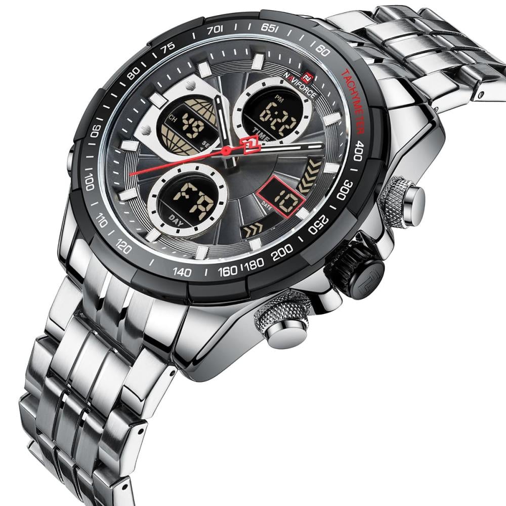 - النوع: ساعة كوارتز رياضية فاخرة للرجال بعرض مزدوج (عقارب ورقمي).